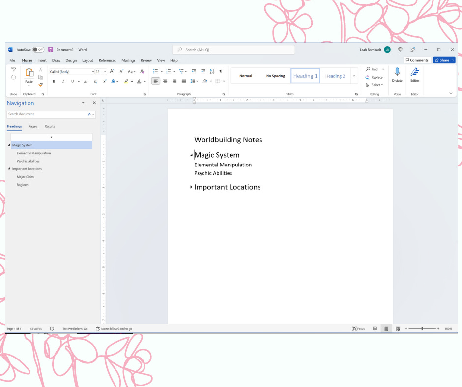 The heading styles are useful for worldbuilding, too. If you’re creating a story world from scratch, the worldbuilding notes can end up being as long as a book, depending on how detailed you get. Keeping your notes organized in a single document using headings can make it easier to navigate your notes, same as with navigating different chapters in long manuscripts.